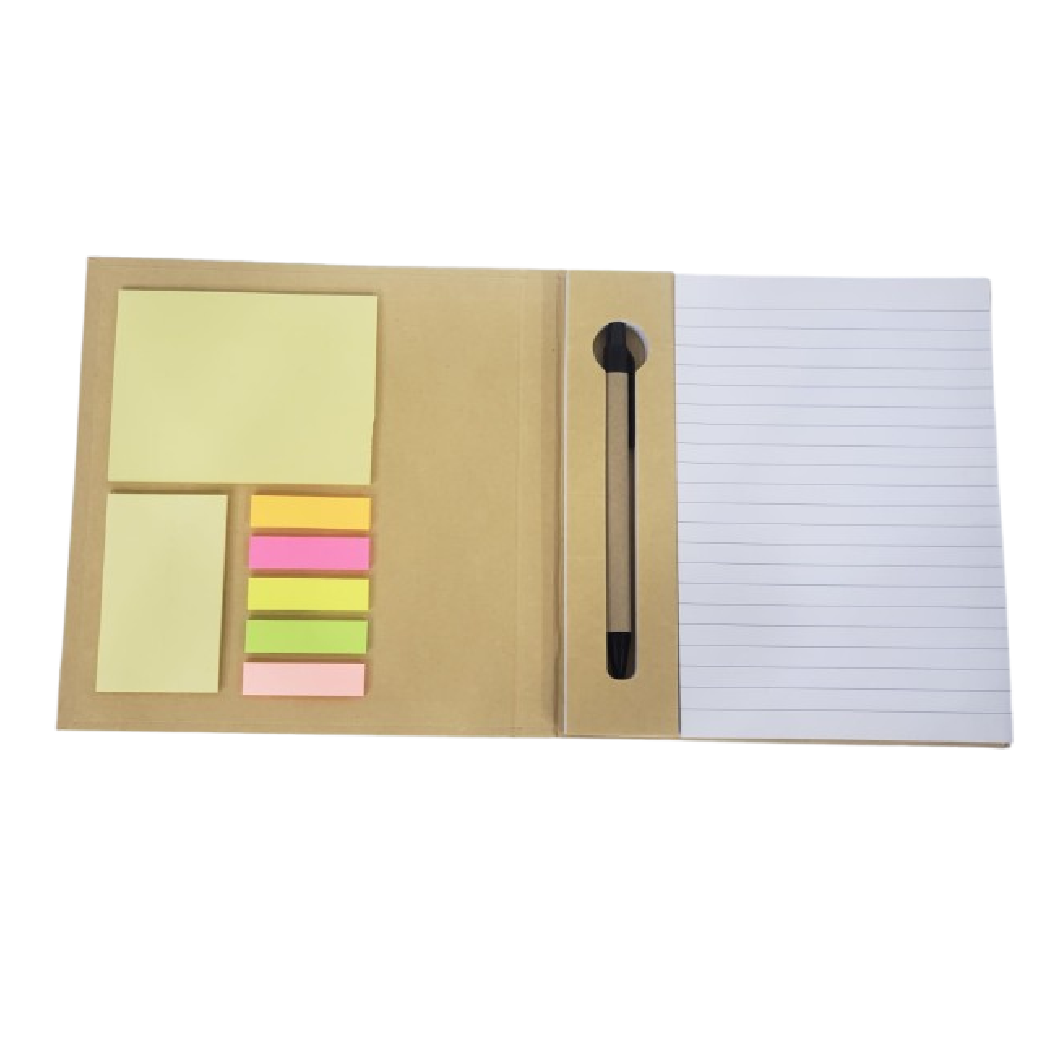 Descripción: Color natural, contiene 50 hojas blancas rayadas, 1 lapicero ecológico, 1 taco post it grande, 1 taco post it mediano y 5 post it pequeños de diferentes colores.