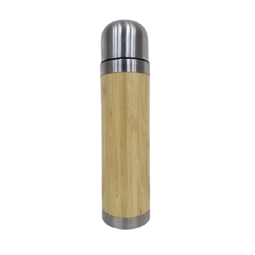 Descripción: Termo metálico de 500 ml. de capacidad, cuerpo recubierto de bambú con tapa de metal
